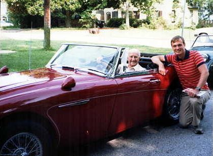 DMH wanted to see my car. I was a little hesitant because I had done some "non issue" things. I found that DMH was an innovator, not a museum curator. If he liked something, he would say so and the reverse if he didn't. For example, I had a pair of plastic rear view mirrors mounted flush on the car and painted to match. He commented that he would have used them but couldn't get that sort of thing back then and had to settle for the ones he did use! I asked him if he would like to sit in my car and he said, "Why, I believe I should" and climbed in. I asked him if he wanted to drive it and he said, "I can't reach the pedals". Fortunately I had my camera and made several photos of him, with a great smile, seated in my Healey.