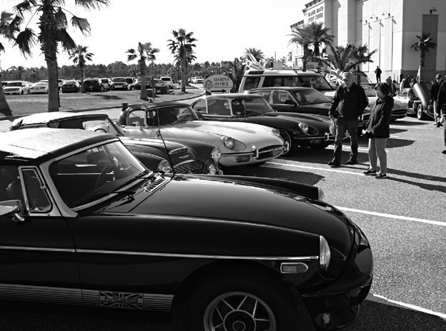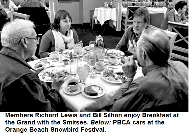 The organizers of the Orange Beach, Ala., Snowbird Festival invited the three area British car clubs to put together a “Show & Shine” display of their LBCs on Saturday, January 10th. Members of South Alabama British Car Club, Mardi Gras MG Club and PBCA weathered 30° temperatures and showed up with 17 cars for the display. The nine PBCA members attending were Keith and Gail Sanders, ’97 Jag XJ6; Vince and Pat Cooke, ’69 XKE Roadster; Tom Schmitz, ’69 XKE 2+2; Rich and Darla Willows, ’58 Austin Healey 100-6; Mike Lindley, ’80 MGB LE; Richard Cunningham, ’64 XKE Coupe; Jerry Crompton, ’07 XK8 Coupe; Allan and Jane Comer, ’14 Jag F-type V8 Roadster; and Bill Moseley, ’80 Triumph TR8.