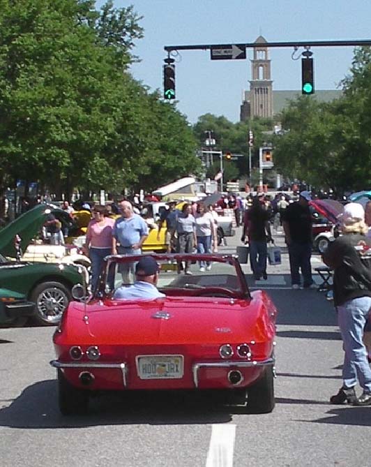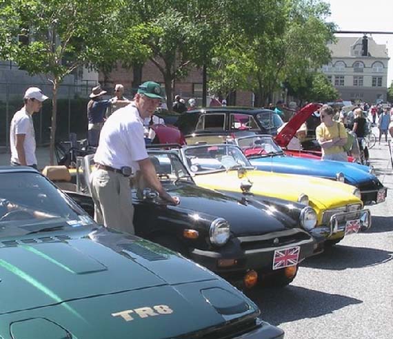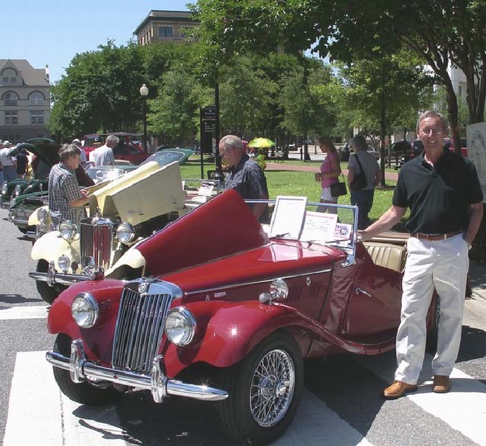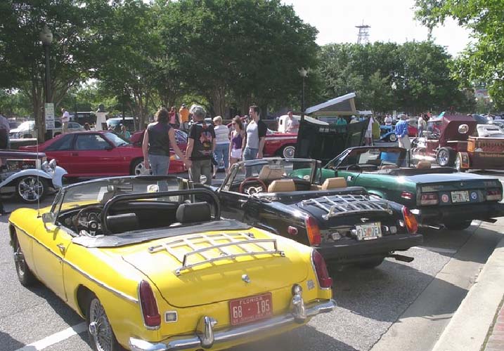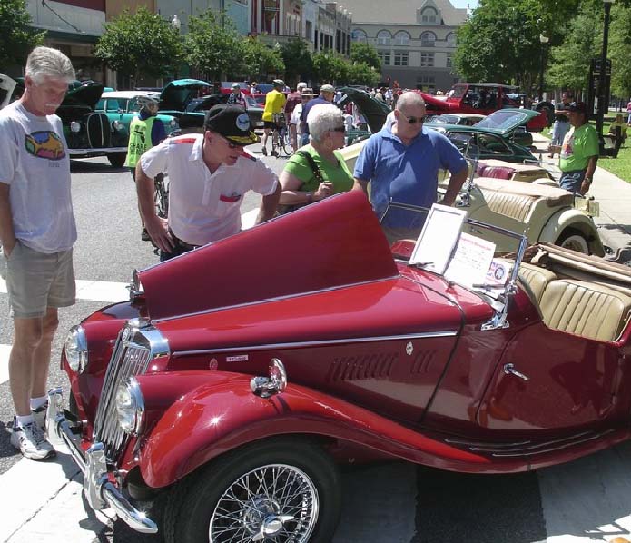 Pensacola Downtown Improvement Board and the Panhandle Cruisers club presented the first show ever to be held on Pensacola’s shady main street. Highly successful, an estimated 7500 visitors strolled through the show area to see the 130 cars – so many people that it was difficult to photograph the cars!! PBCA had thirteen very nice cars in the event. There would have been still more Brits but there wasn’t much lead-time and Mardi Gras MGs was committed to the City of Daphne, AL. Bill Weeks asked PBCA drivers to meet at his home, which isn’t far from downtown, and drive in as a group. This worked nicely. The Downtown Improvement Board selected the top 20. George Mohanco’s BRG ’56 Jaguar XK-140 Drophead took one of the trophies. The nice little restaurants and other businesses on Palafox Street were prepped for the event and set up sidewalk displays. They reported that they were very happy with the beautiful cars as well as the extra business. The City of Pensacola invited the Cruisers to continue the event and expand it into a major judged show that will include the two fixed British Classes and the “Expanded British Classes” with marque or make splits.The 13 PBCA cars were driven by Bob Henson, Ralph Overly, Bill Silhan, Tom Schmitz, Al DeWeese, Curt Derby, Joe Hajcak, Bob Manske, George Mohanco, Bill Moseley, Gus Fell, Bill Weeks, and Bill Weeks’ son, Will Weeks.